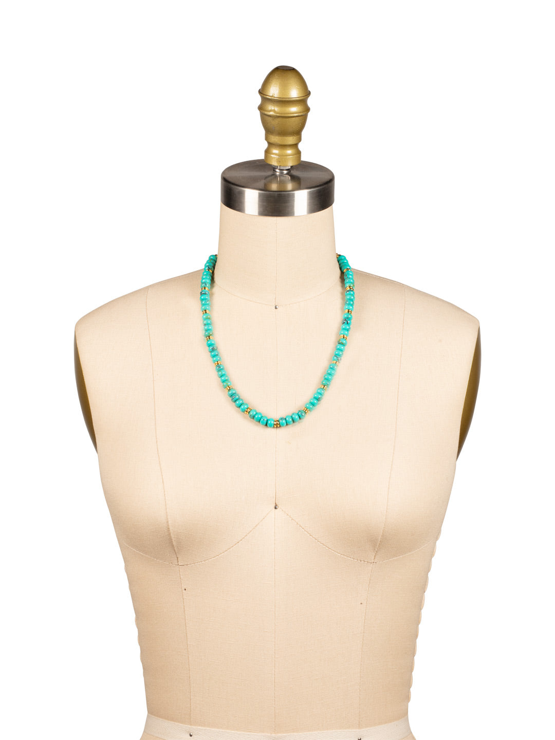 The Capri Beaded Tennis Necklace features a strand of turquoise beads on an adjustable chain, secured by a lobster claw clasp. 16-20 inches. From Sorrelli's Turquoise collection in our Bright Gold-tone finish.