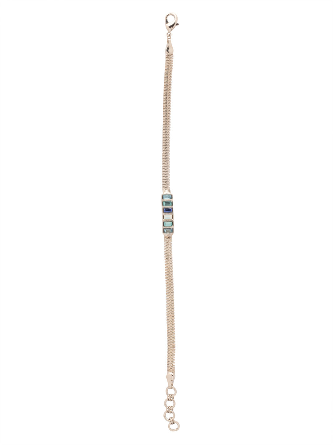 The Secily Tennis Bracelet features a row of small baguette-cut crystals on an adjustable snake chain, secured with a lobster claw clasp. From Sorrelli's Electric Blue collection in our Palladium finish.