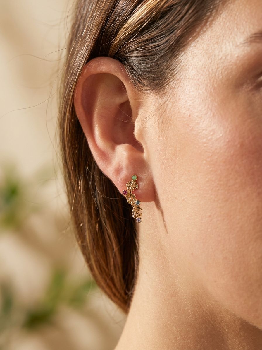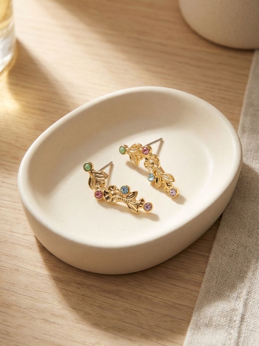 The Blossom Stud Earrings feature a delicate floral vine silhouette accented by small, round stones. Designed for versatility, this piece can be worn as a traditional stud or positioned as an ear crawler for a modern, contoured look. Its secure post-back design ensures a comfortable and stable fit in either orientation. From Sorrelli's Candy Pop collection in our Bright Gold-tone finish.