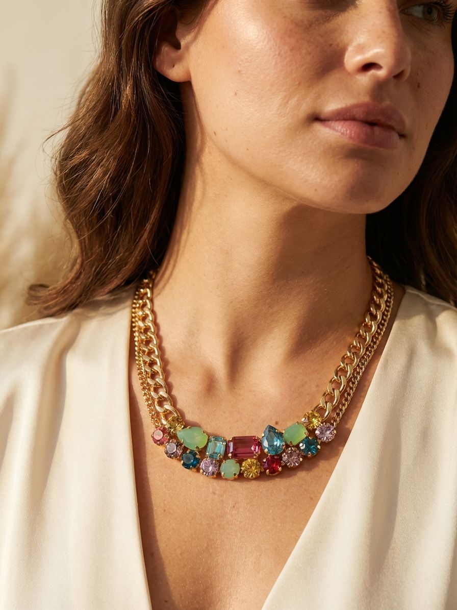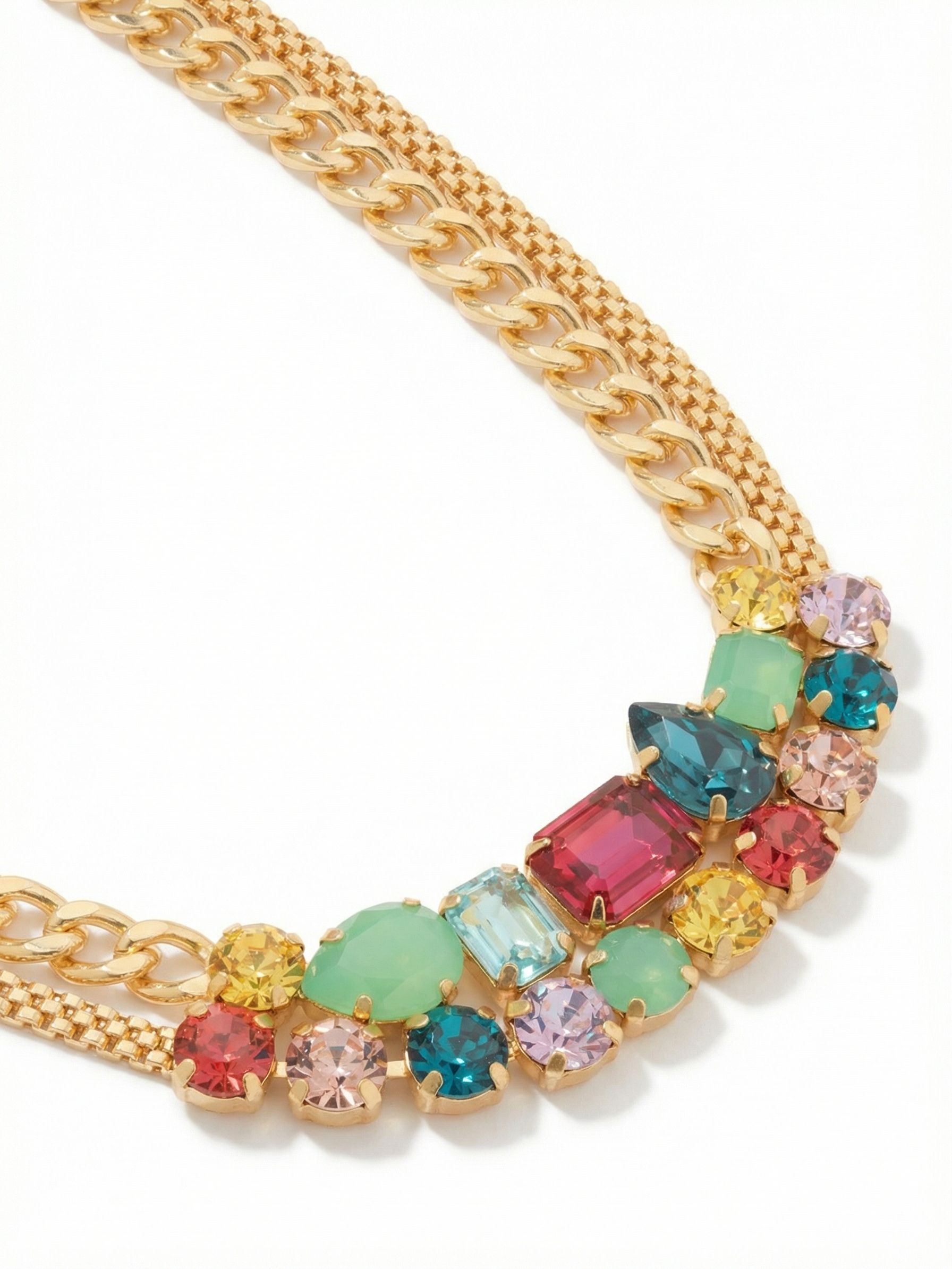 The Moxie Tennis Necklace features an eclectic mix of assorted crystals set along a bold, multi-strand link chain. An adjustable extender and lobster clasp allow for a personalized fit and a modern, statement look. From Sorrelli's Candy Pop collection in our Bright Gold-tone finish.